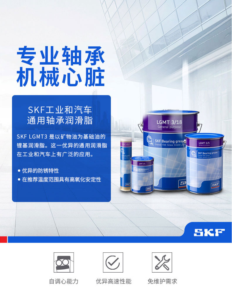 SKF工業和汽車通用軸承潤滑脂 SKF LGMT3是以礦物油為基礎油的鋰基潤滑脂。這一優異的通用潤滑脂在工業和汽車上有廣泛的應用。